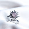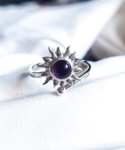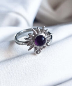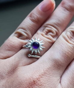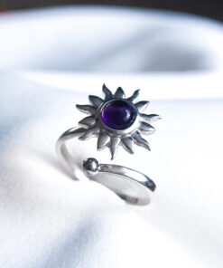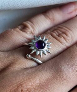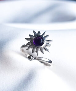 Usar un anillo con un amuleto con sol y amatista que gira ofrece una combinación poderosa para aliviar el estrés. El sol simboliza vitalidad, energía positiva y claridad, mientras que la amatista promueve la paz interior, la claridad mental y la protección espiritual. El movimiento giratorio del anillo actúa como una herramienta antiestrés, ayudando a liberar tensión y ansiedad.